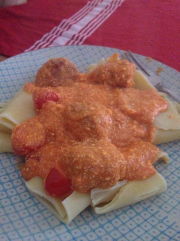 5. Now add the meatballs to the tomato sauce, the cherry tomatoes and the garlic and let it simmer for a little6. Add it to the pasta and voila. Pretty pretty tasty. The sauce is real awesome friends.