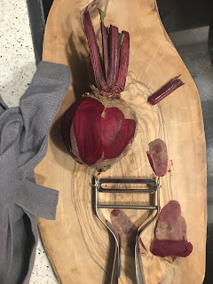 1. For this recipe you need to basically have 2 pots going and then mix them. So first we will start with the beet soup. Peel the beet and cut in pieces and place it in a big pot with 1 litre of cold water, salt and pepper.